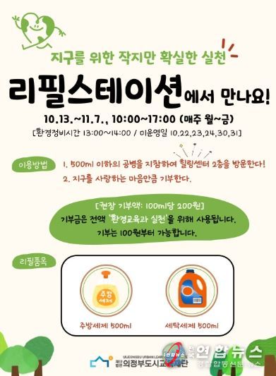 전국연합뉴스 박점규 기자 | (재)의정부도시교육재단은 10월 13일부터 11월 7일까지 매주 월요일부터 금요일, 오전 10시부터 오후 5시까지 힐링센터 2층에서 생활 속 친환경 실천 활동 ‘리필스테이션’을 운영한다.
