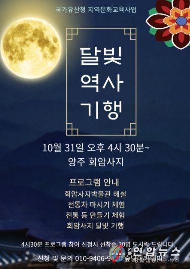 행사에서는 박물관 야외 미디어파사드, 전통차 체험, 전통등 만들기, 양주 회암사지(유적지)달빛 기행 투어 등 다채로운 프로그램이 진행될 예정이며, 참가신청은 전화 또는 이메일로 가능하다.