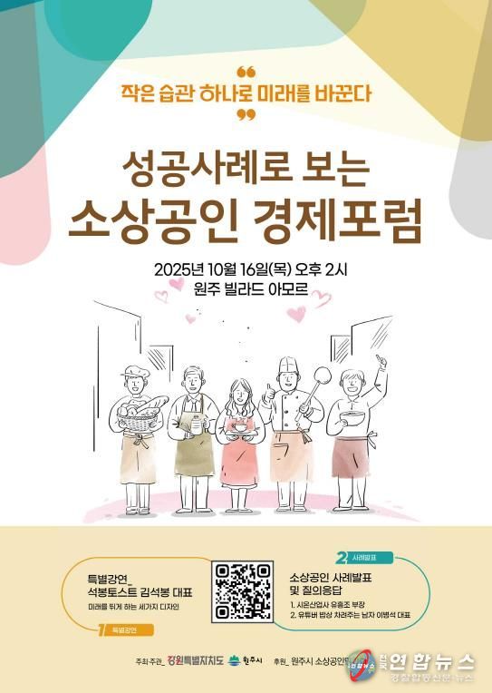 전국연합뉴스 유근택 기자 | 원주시와 강원특별자치도는 오는 16일 오후 2시 빌라드아모르 원주에서 제4회 ‘성공사례로 보는 소상공인 경제포럼’을 개최한다.