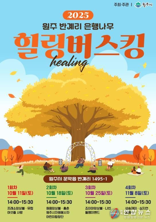 2025 힐링 버스킹은 앞으로 3회(10월 18일·25일, 11월 8일) 공연을 남겨두고 있으며, 문막읍 반계리 은행나무 광장에서 오후 2시부터 3시 30분까지 진행된다.