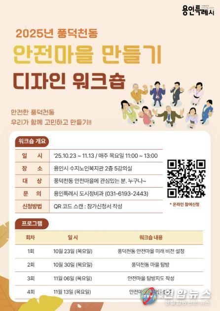 전국연합뉴스 박남호 기자 | 용인특례시는 수지구 풍덕천동 ‘안전마을 만들기 디자인 워크숍’ 참가자를 모집 중이라고 15일 밝혔다.