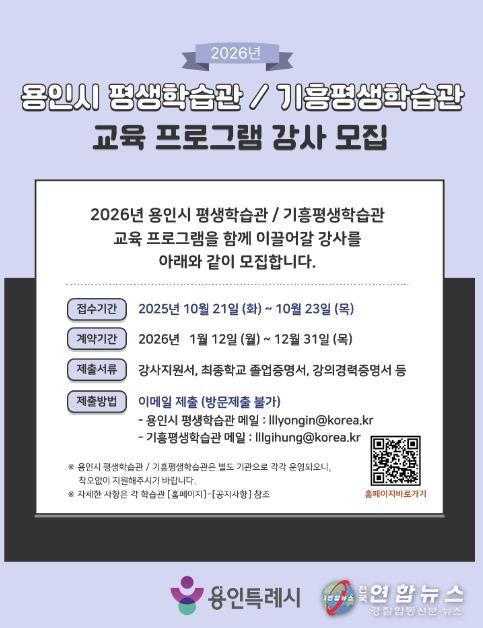 전국연합뉴스 박남호 기자 | 용인특례시는 21일부터 23일까지 3일간 ‘2026년 평생학습관 프로그램’을 운영할 강사를 모집한다고 15일 밝혔다.