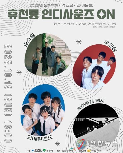 또한 10월 19일(일)에는 STAXX(영주시 대학로86번길 14)에서 ‘휴천동 인디사운즈 on’이 개최된다. 영주와 외부 청년 아티스트들이 함께하는 로컬 뮤직 페스티벌로, 오예린밴드, 모스힐, 베이루트 택시, 유인원 등이 출연해 청춘의 열기를 음악으로 전한다.