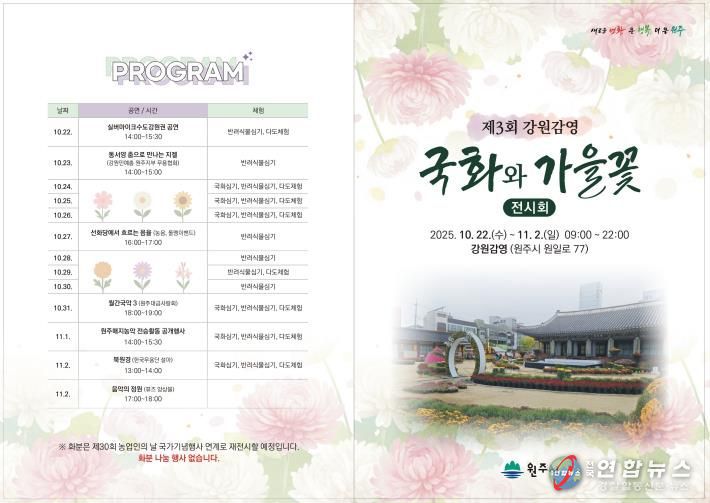 이에 더해 11월 1일 오후 2시에는 가을꽃으로 물든 강원감영을 배경으로 강원특별자치도 무형유산 원주매지농악 전승활동 공개행사가 펼쳐져 관람객들에게 색다른 볼거리를 선사할 예정이다.