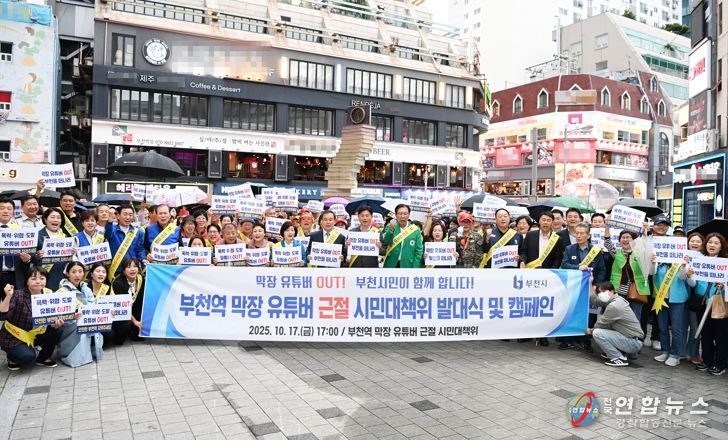 전국연합뉴스 김명환 기자 | 부천시는 10월 17일 부천역 피노키오광장과 마루광장에서 ‘부천역 막장 유튜버 근절 시민대책위원회’ 발대식과 가두캠페인을 열었다. 이날 행사에는 조용익 부천시장과 각 단체 회원, 시민 등 200여 명이 참석했다.