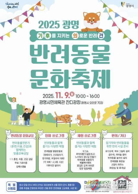 박승원 광명시장은 “반려동물 문화축제는 사람과 동물이 함께 행복한 생명존중 도시로 나아가는 발판이 될 것”이라며 “작은 생명 하나하나가 존중받는 따뜻한 공동체가 될 수 있도록 노력하겠다”고 밝혔다.