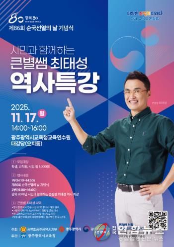 전국연합뉴스 기자 | 광주시교육청은 광복 80주년과 제86회 순국선열의 날을 맞아 오는 17일 광주시교육청교육연수원 대강당에서 ‘시민과 함께하는 ’큰별쌤‘ 최태성 역사 특강’을 개최한다.