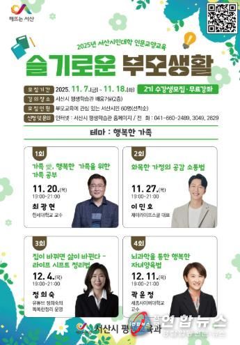 전국연합뉴스 김용태 기자 | 서산시는 가족의 행복을 주제로 한 부모 교육 프로그램 '슬기로운 부모생활 2기' 수강생을 11월 7일부터 11월 18일까지 모집한다고 밝혔다.
