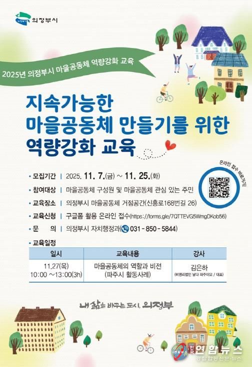 전국연합뉴스 박점규 기자 | 의정부시는 11월 27일 의정부시 마을공동체 거점공간(신흥로168번길 26)에서 ‘마을공동체 역량 강화 교육’을 운영한다.