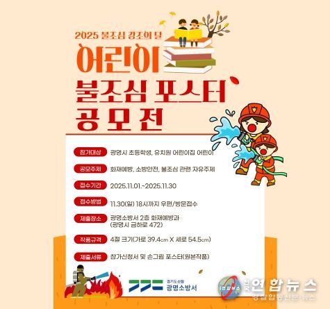 전국연합뉴스 조민준 기자 | 광명소방서는 ‘불조심 강조의 달’을 맞아 ‘2025 어린이 불조심 포스터 공모전’을 개최한다고 11일 밝혔다.