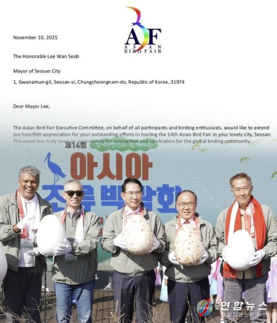 시는 지난 11월 1일부터 2일까지 천수만 일원에서 제14회 아시아 조류박람회를 성공적으로 개최한 가운데, 아시아 조류박람회 집행위원회로부터 감사의 서한을 받았다고 밝혔다.