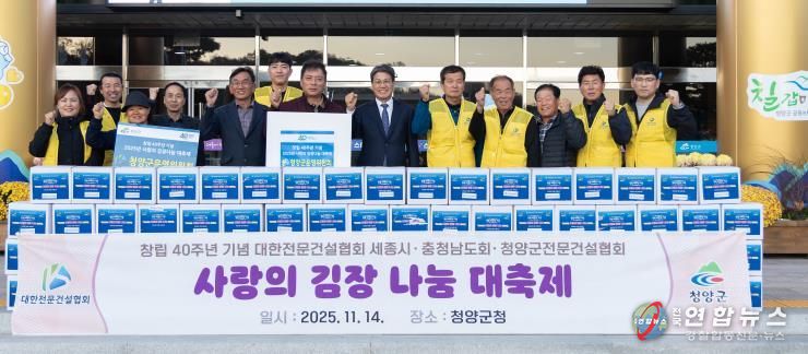 전국연합뉴스 김용태 기자 | 청양군은 대한전문건설협회 청양군운영위원회가 정성껏 담근 김장김치 100박스를 기탁하며 지역 나눔 실천에 앞장섰다고 17일 밝혔다.