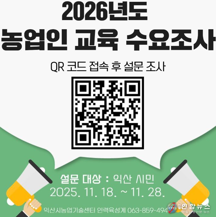 전국연합뉴스 최성용 기자 | 익산시가 농업인의 실제 필요를 교육 정책에 반영하기 위해 '2026년도 농업인 교육 수요 조사'를 시작했다.