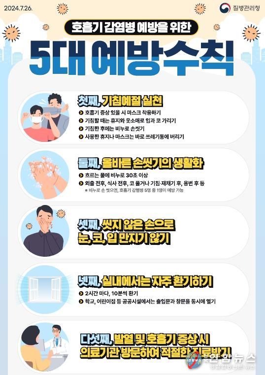 인플루엔자를 예방하기 위해서는 ▲올바른 손 씻기 생활화(흐르는 물에 비누로 30초 이상 씻기) ▲기침 예절 실천(기침할 때 휴지나 옷소매로 입과 코를 가리기) ▲씻지 않은 손으로 눈, 코, 입, 만지지 않기 ▲실내에서는 자주 환기 ▲발열 및 호흡기 증상 시 의료기관 방문해 진료받기 등 5대 예방수칙을 실천하는 것이 중요하다.