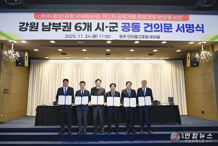 전국연합뉴스 유근택 기자 | 강원 남부권 6개 시군(원주·횡성·영월·평창·정선·태백)은 24일 오전 11시, 호텔인터불고 원주에서 국토교통부의 ‘제7차 공항개발 종합계획’에 ‘원주(횡성)공항의 국제화 사업 반영’을 요청하는 공동 건의문을 채택했다.