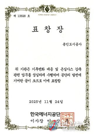 신경철 용인도시공사 사장은“이번 표창은 전 임직원이 함께 노력한 결과이며, 앞으로도 지역사회와 함께 기후위기 대응에 앞장서겠다”라며“지속가능한 도시를 만들기 위해 친환경 경영을 더욱 강화해 나갈 것”이라고 전했다.