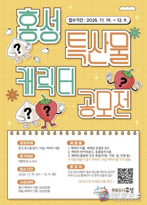 전국연합뉴스 김용태 기자 | 홍성군은 홍성의 대표 특산물인 딸기와 마늘을 활용한 ‘홍성 특산물 캐릭터 공모전’을 실시한다. 본 공모전은 지역 농산물의 인지도 확대와 홍성군의 브랜드 이미지를 강화하기 위해 마련됐다.