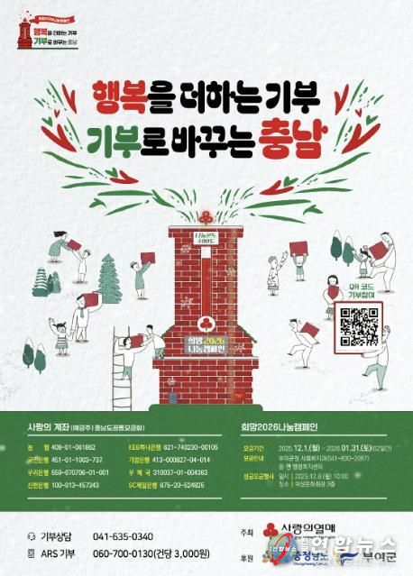 전국연합뉴스 김용태 기자 | 부여군은 충남사회복지공동모금회와 함께 내달 1일부터 2026년 1월 31일까지 62일간 ‘희망 2026 나눔 캠페인’을 실시한다고 밝혔다.