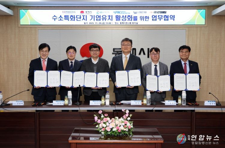 전국연합뉴스 김생수 기자 | 동해시는 11월 28일 동해시청 본관 2층 회의실에서 강원특별자치도, 피케이밸브앤엔지니어링㈜, ㈜성원기업, ㈜진화메탈, ㈜GS동해전력과 함께 수소특화단지 기업유치 활성화를 위한 업무협약(MOU)을 체결했다고 밝혔다.