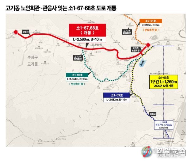 전국연합뉴스 박남호 기자 | 용인특례시는 지난 11월 30일 수지구 고기동 노인회관에서 관음사까지 이어지는 도시계획도로 소1-67·68호선(연장 2.58km)을 개통했다고 1일 밝혔다.