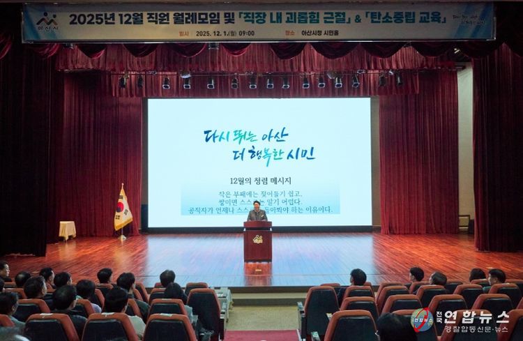 전국연합뉴스 김용태 기자 | 아산시는 1일 시청 시민홀에서 12월 직원월례모임을 열고 올 한 해 주요 시정 성과를 공유하며 연말 마무리와 내년도 시정 방향을 논의했다.