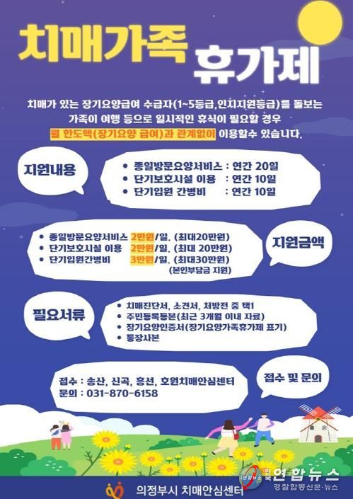 전국연합뉴스 박점규 기자 | 의정부시 보건소 치매안심센터는 치매 환자를 돌보는 가족의 돌봄 부담을 완화하고 건강한 휴식을 지원하기 위해 치매가족돌봄 안심휴가지원 서비스(치매가족 휴가제)를 운영하고 있다.
