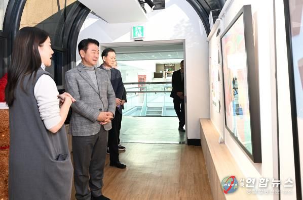 이날 김동근 시장은 본관 1층 로비에서 담은캘리그라피의 ‘영화 속 명대사(한글의 아름다움)’ 전시를 감상한 뒤, 연결통로로 이동해 ‘같이 걷는 발걸음’의 최소라 작가를 격려하고, 전시 공간 운영 방향에 대한 의견을 청취했다.