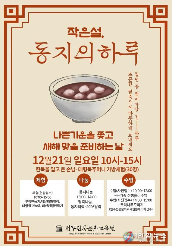 전국연합뉴스 유근택 기자 | 원주전통문화교육원은 오는 21일 오전 10시부터 오후 3시까지 가족과 함께 겨울 세시풍속을 체험하는 ‘작은 설, 동지의 하루’를 개최한다.