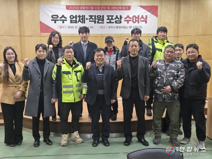전국연합뉴스 유근택 기자 | 원주시는 12월 16일 '2025년 생활폐기물 수집ㆍ운반 대행업체 평가결과'에 따른 우수등급 업체 및 소속 직원을 대상으로 원주시장 상장 및 표창장을 수여한다.