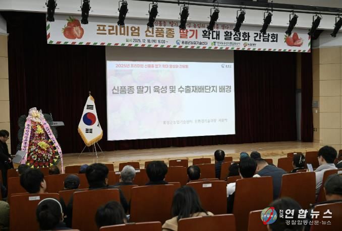 군에 따르면 지난 18일 홍성군농업기술센터 대강당에서 ‘국내·외 딸기산업 경쟁력 강화를 위한 프리미엄 신품종 딸기 확대 활성화 간담회’를 성황리에 개최했다. 이날 행사에는 유관기관 관계자와 수출업체, 유통 전문 벤더, 딸기농업인 등 150여 명이 참석해 홍성 신품종 딸기의 육성 성과와 수출 확대 방안을 공유했다.