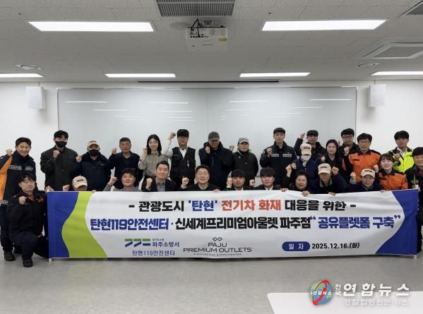 전국연합뉴스 박충곤 기자 | 파주소방서 탄현119안전센터는 16일 신세계사이먼 파주 프리미엄아울렛과 함께 탄현면 관광단지 내 전기차 화재에 신속 대응하기 위한 화재진압 장비 ‘공유플랫폼’을 구축했다.