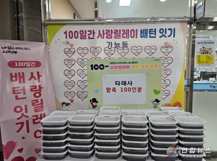 전국연합뉴스 박점규 기자 | 의정부시 가능동주민센터는 12월 19일 한국불교태고종 타래사가 동지를 맞아 팥죽 100그릇을 기탁하며 ‘100일간 사랑릴레이 배턴 잇기’에 동참했다고 밝혔다.