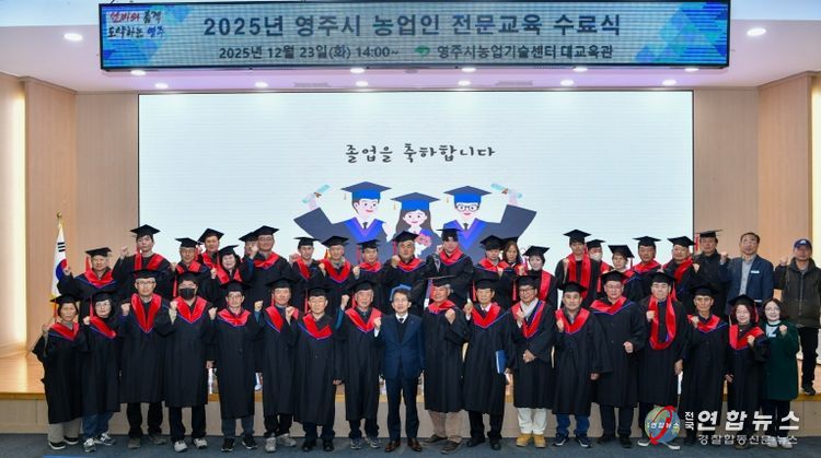 전국연합뉴스 김삿갓 기자 | 영주시는 지난 23일 농업기술센터 대교육관에서 '2025년 농업인 전문교육 수료식'을 열고, 1년간의 교육 과정을 마친 교육생 74명의 수료를 축하했다.