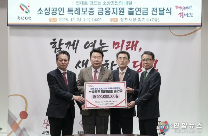 전국연합뉴스 김용태 기자 | 당진시는 지난 24일 시청 접견실에서 오성환 당진시장과 김훈희 한국동서발전 당진발전본부장, 함종덕 하나은행 충남북영업본부 지역대표, 조소행 충남신용보증재단 이사장이 참석한 가운데, 소상공인 금융지원을 위한 '특례보증 출연금 전달식'을 개최했다고 26일 밝혔다.