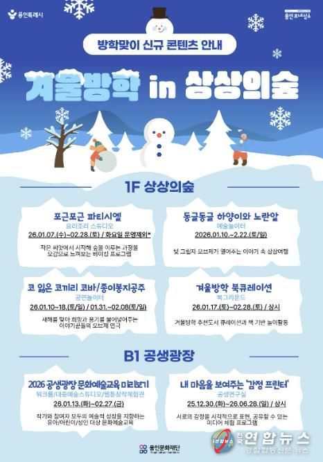 전국연합뉴스 박남호 기자 | 용인문화재단은 2026년 겨울방학을 맞아 복합문화공간 용인어린이상상의숲과 용인문화도시플랫폼 공생광장에서 아이들과 가족이 함께 즐길 수 있는 다양한 신규 콘텐츠를 선보인다.