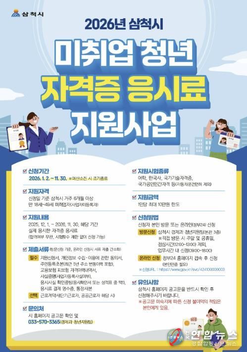 전국연합뉴스 권찬규 기자 | 삼척시는 미취업 청년의 자격증 취득에 따른 경제적 부담을 완화하고 취업역량 강화를 지원하기 위해 '2026년 삼척시 미취업 청년 자격증 응시료 지원사업'을 추진한다고 밝혔다.