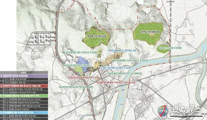 이를 구체화하여 △읍내동산성 및 성안말산성의 수목정비와 탐방로 정비 △읍내동 지역 거리 조성 기반구축 △역사정원 가꾸기 및 역사놀이터 조성 △역사문화권 방문자 센터 및 복합커뮤니센터 조성 △게스트 하우스와 마을도서관 조성 △보행환경 개선 △다양한 역사문화권 교육프로그램 운영 등으로 실행계획을 수립했다.