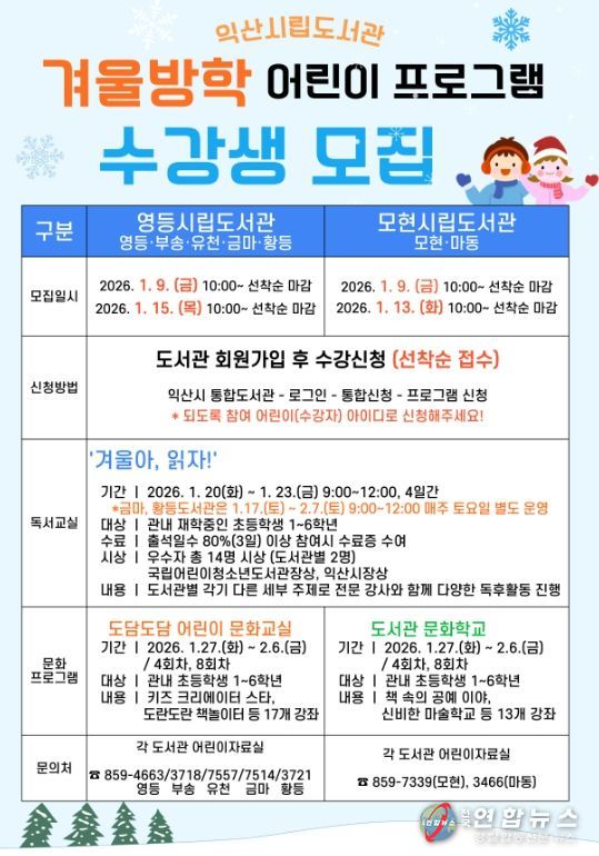 전국연합뉴스 최성용 기자 | 익산시가 겨울방학을 맞은 초등학생들을 위해 독서와 체험이 어우러진 다채로운 프로그램을 마련했다.