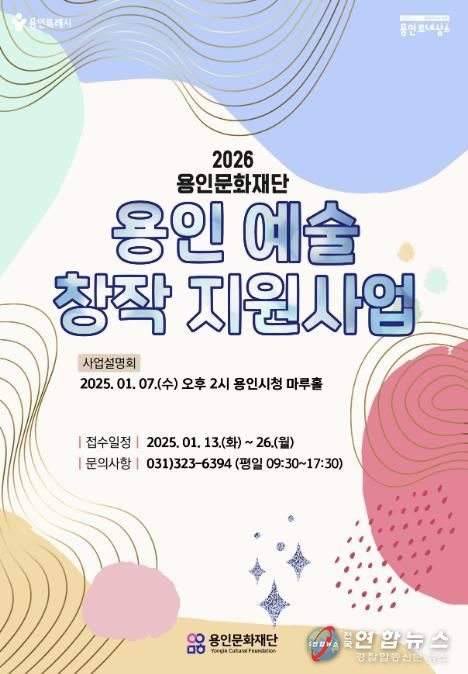 전국연합뉴스 박남호 기자 | 용인문화재단은 기존'문화 예술 공모 지원사업'을 전면 개편하고, 사업명을 ‘2026 용인 예술 창작 지원’으로 변경해 새롭게 전환한다고 밝혔다. 이번 사업은 지난 6일 공고됐으며, 1월 13일부터 26일까지 접수를 통해 총 6억 400만 원의 지원금을 사업 유형과 규모에 따라 차등 지원할 예정이다.