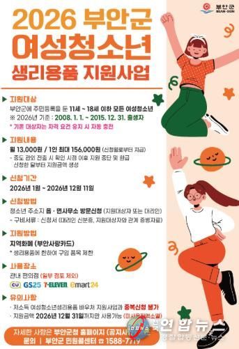 부안군 관계자는 “여성청소년 생리용품 지원은 신청한 달부터 지원받을 수 있으므로, 특히 1월 집중신청기간에 대상 청소년들이 빠짐없이 혜택을 받을 수 있기를 바란다”고 말했다.
