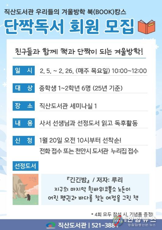 전국연합뉴스 김대환 기자 | 천안시 직산도서관은 겨울방학을 맞아 내달 5~ 26일 청소년 독서동아리 ‘단짝독서’를 운영한다고 16일 밝혔다.