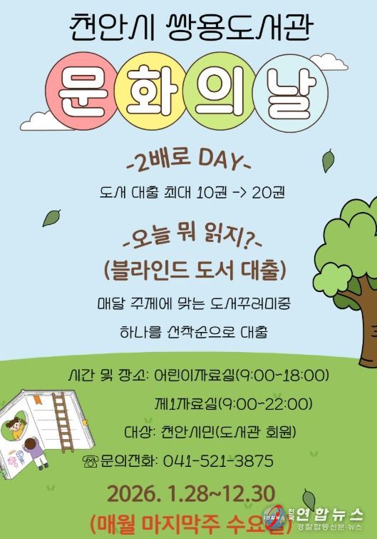 전국연합뉴스 김대환 기자 | 천안시 쌍용도서관은 매달 마지막주 수요일 ‘2026 문화가 있는 날’ 행사를 운영한다고 16일 밝혔다.