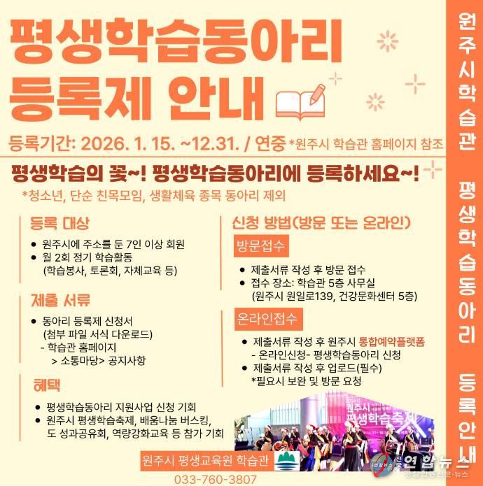 전국연합뉴스 유근택 기자 | 원주시 평생교육원 학습관은 관내에서 활동하고 있는 잠재적 평생학습동아리를 발굴하기 위해 ‘평생학습동아리 등록제’를 운영하고 있다.