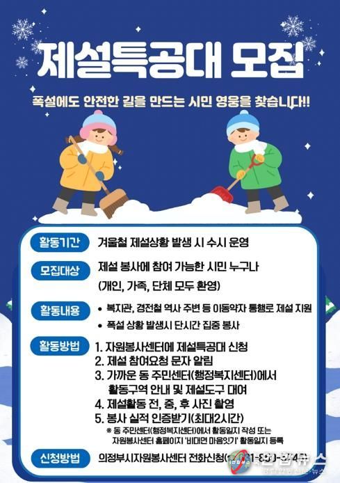 전국연합뉴스 박점규 기자 | 의정부시는 겨울철 폭설로 인한 시민 불편을 최소화하고 안전한 보행환경을 조성하기 위해 ‘제설특공대’를 모집한다.
