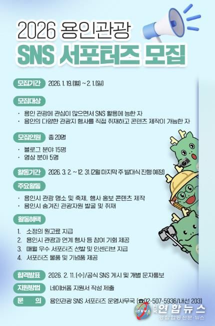 전국연합뉴스 박남호 기자 | 용인특례시는 2월 1일까지 용인의 관광자원과 다채로운 축제·행사를 시민의 시각에서 생동감 있게 홍보할 ‘용인관광 SNS 서포터즈’를 모집한다고 20일 밝혔다.