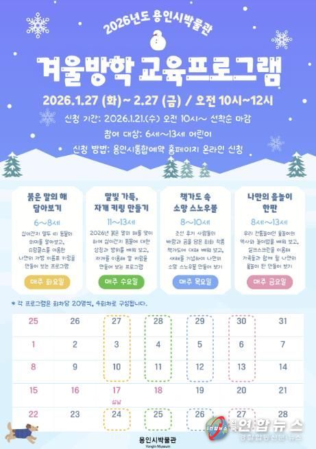 전국연합뉴스 박남호 기자 | 용인시박물관은 어린이들이 역사와 전통문화를 쉽고 재미있게 체험할 수 있는 ‘2026년 겨울방학 교육 프로그램’을 운영한다고 20일 밝혔다.