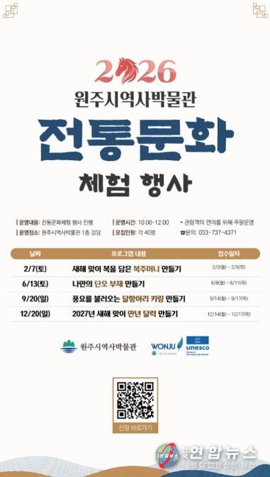 전국연합뉴스 유근택 기자 | 원주시역사박물관은 새해를 맞아 ‘2026 전통문화 체험 행사’를 운영한다.