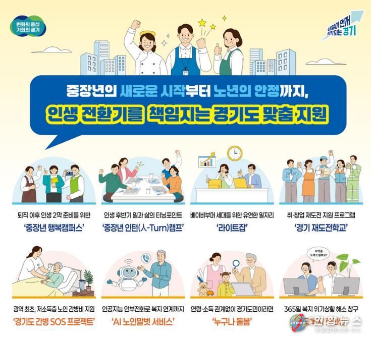 전국연합뉴스 조민준 기자 | 퇴직 이후의 삶을 어떻게 꾸려야 할지 고민하는 중장년부터, 간병과 돌봄 문제로 어려움을 겪는 어르신과 가족까지. 경기도는 올해도 도민이 인생의 전환기에서 새로운 기회를 얻고 안정적으로 생활할 수 있도록 맞춤형 정책을 계속해 나간다.