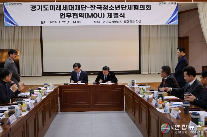 전국연합뉴스 조민준 기자 | 경기도미래세대재단은 27일 수원시 팔달구 옛 경기도청사에서 한국청소년단체협의회와 청소년의 건강한 성장과 글로벌 역량 강화를 위한 업무협약을 체결했다.