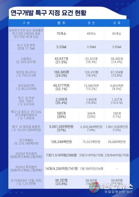 특구 지정 면적에서도 원주의 비중은 크다. 원주 지역 특구 면적은 5.52㎢로, 춘천·강릉을 포함한 전체 특구 면적 11.7㎢의 절반가량을 차지하고 있다.